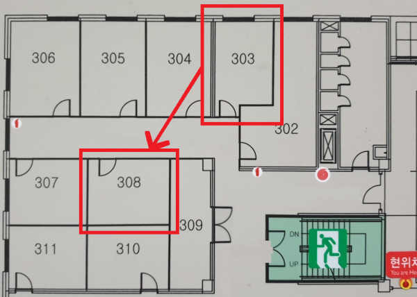 기존의 303호에서 이전 S.I.S TIME이 쓰던 308호로 동방을 옮기게 되었습니다. 자세한 위치는 첨부된 사진을 참고해주시길 바랍니다!